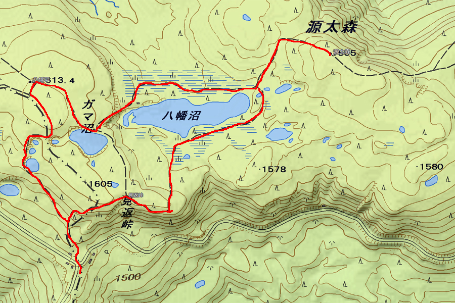 〇コース・所要時間:頂上駐車場⇒鏡沼・メガネ沼⇒八幡平頂上⇒ガマ沼・八幡沼⇒源太森⇒見返り峠⇒頂上駐車場