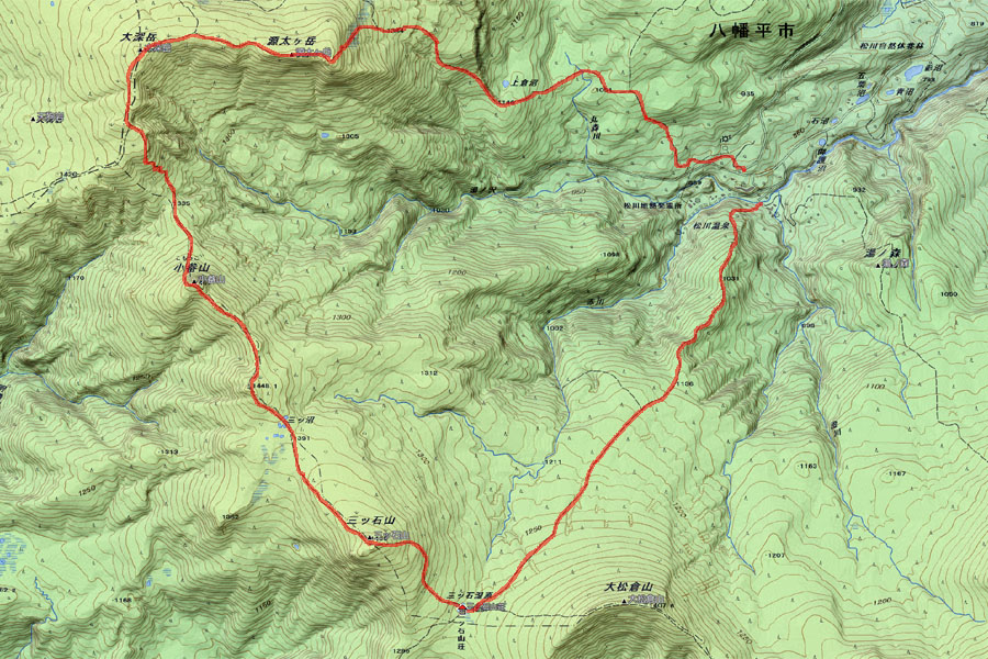 〇コース・所要時間:松川温泉⇒源太ヶ岳⇒大深岳⇒小畚山⇒三ツ石山⇒三ツ石山荘⇒松川温泉 約9時間