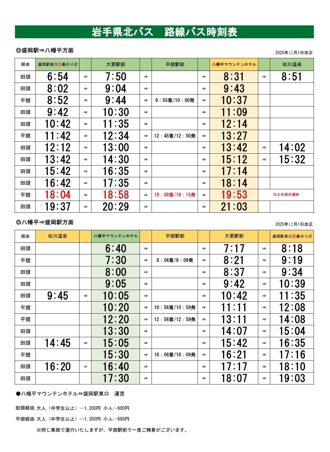 交通アクセス 盛岡駅⇔八幡平リゾート 路線バス時刻表《岩手県北バス》12.1改正