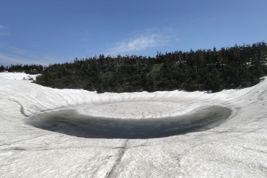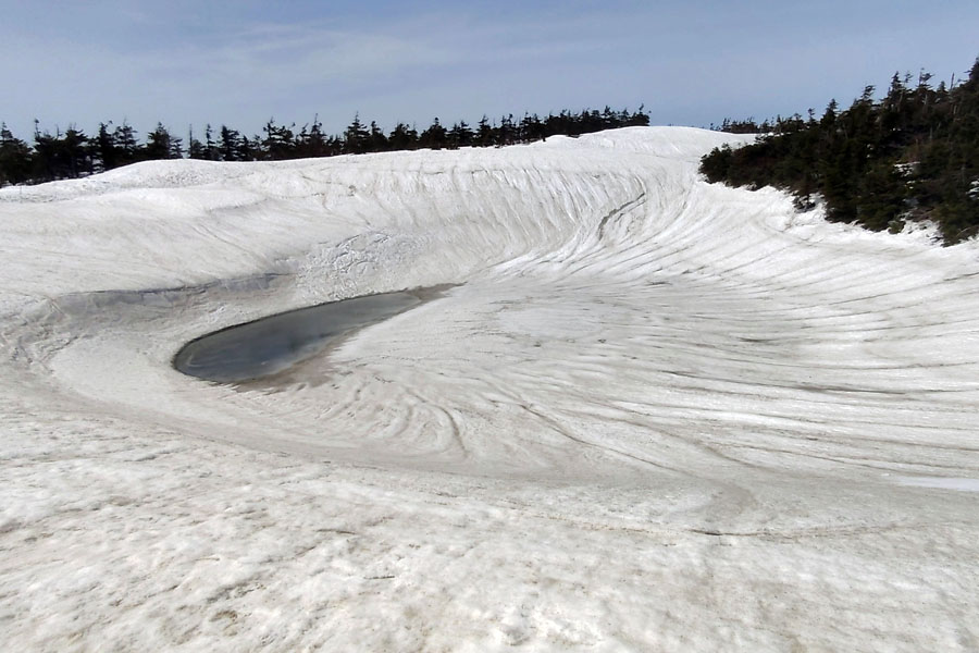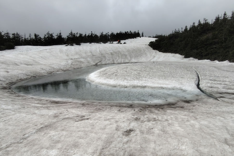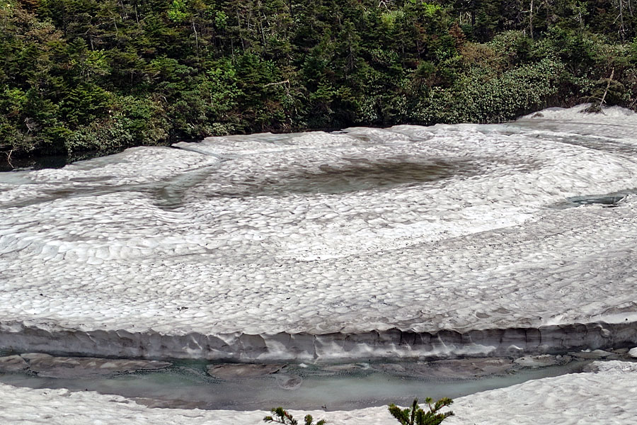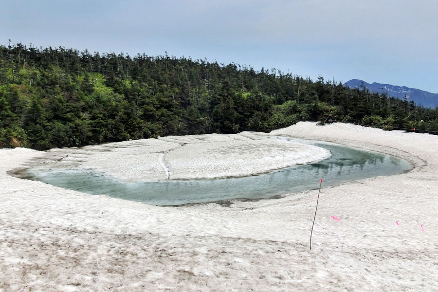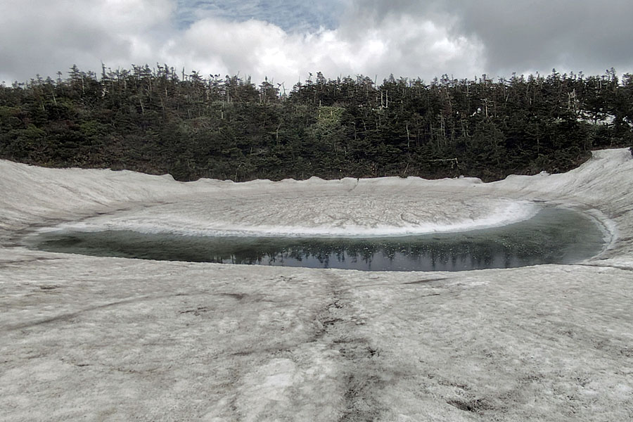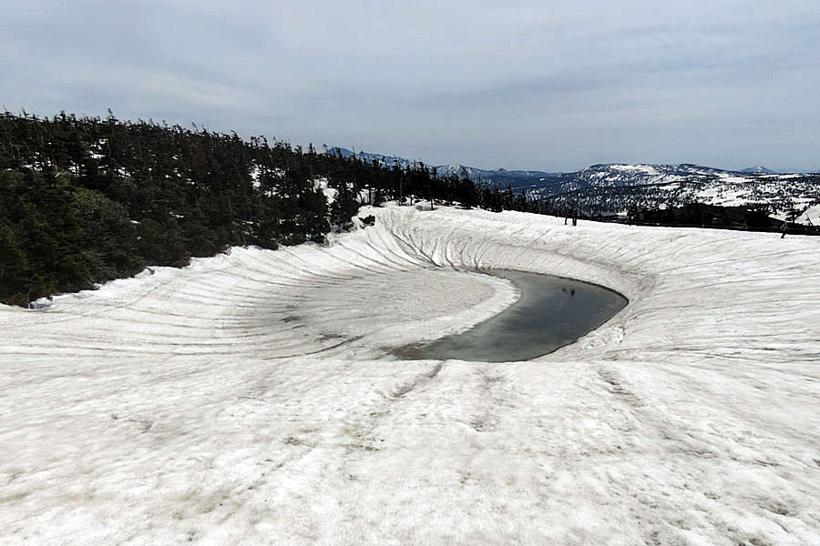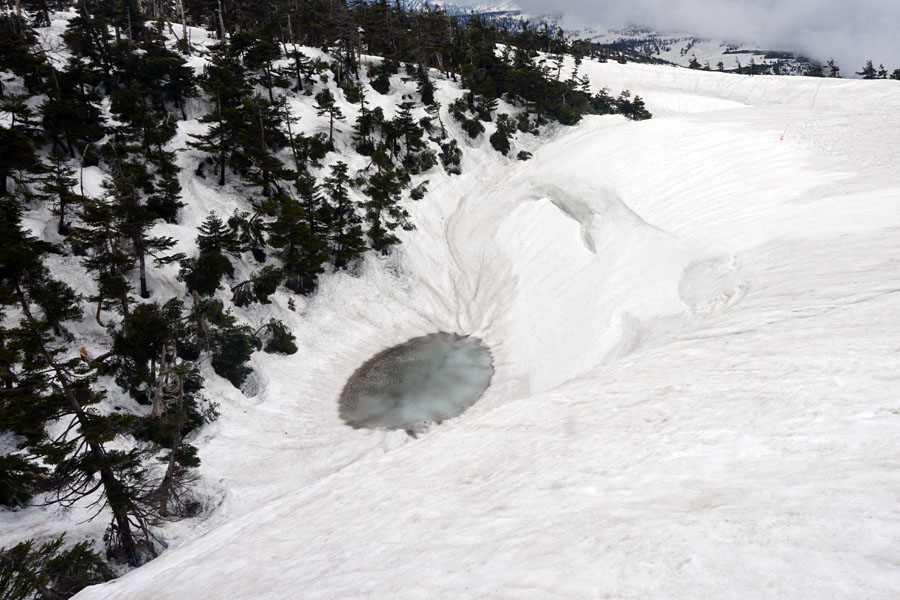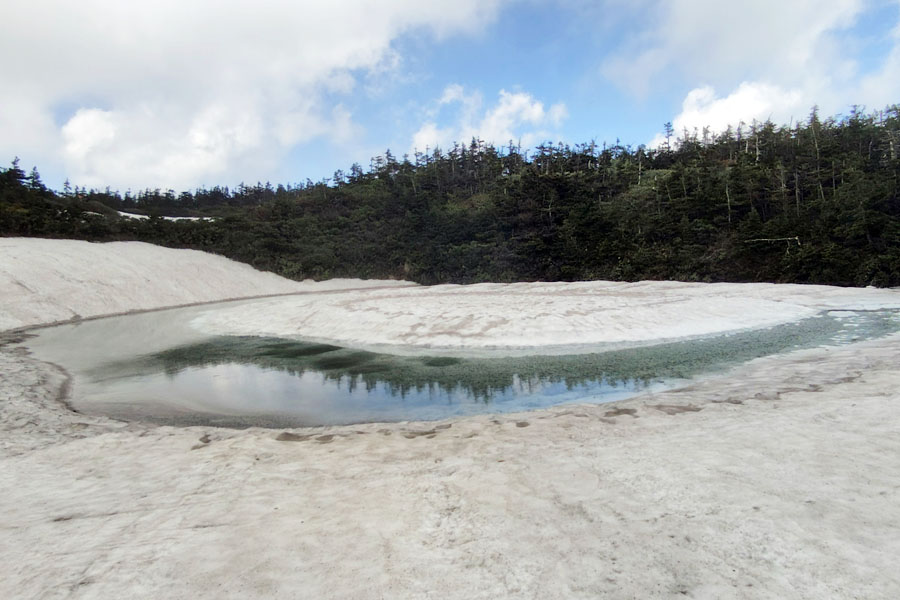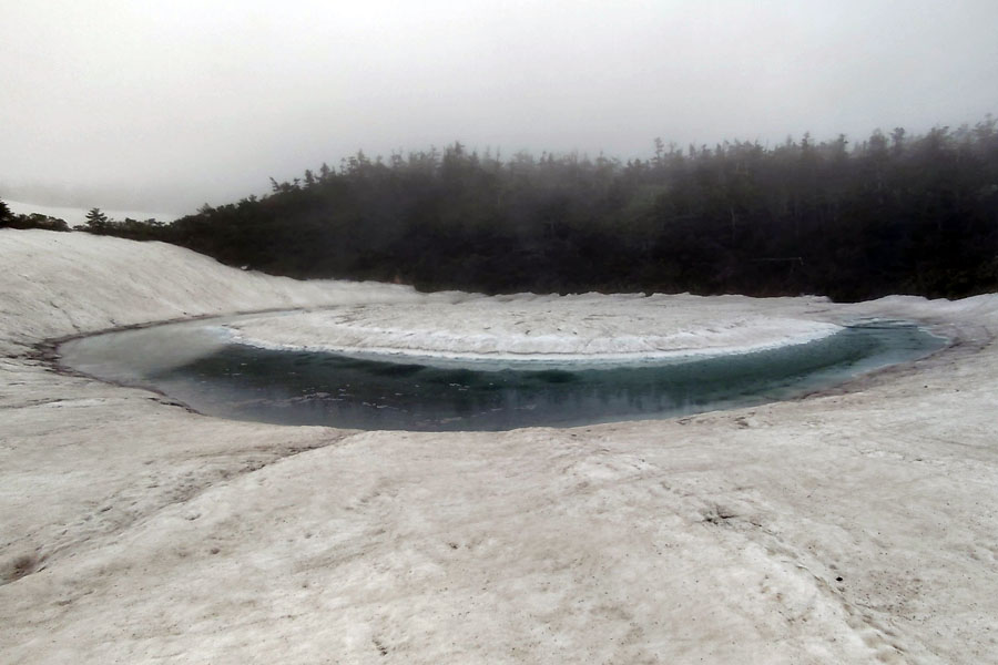 この後、この写真の左側の雪が融けて水面が中央部の雪の丘を囲うように円周形に水溜りが出来ればきれいなドラゴンアイができると思います。