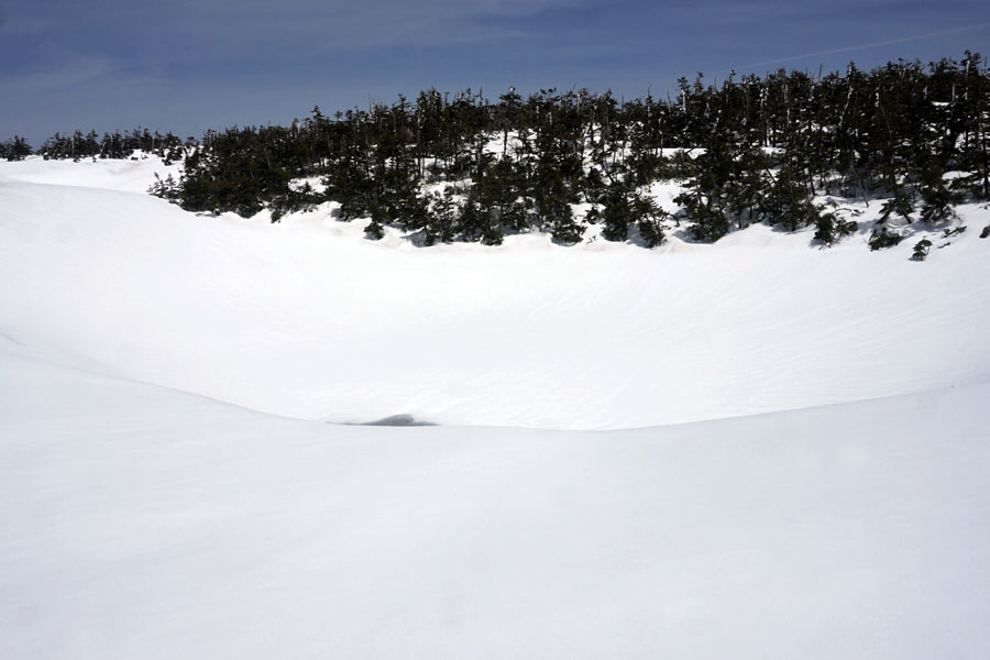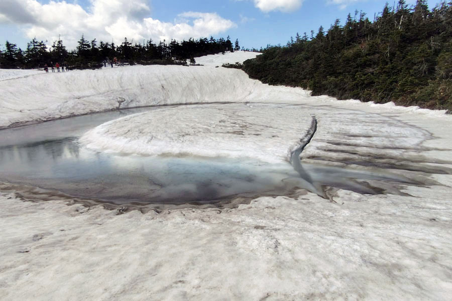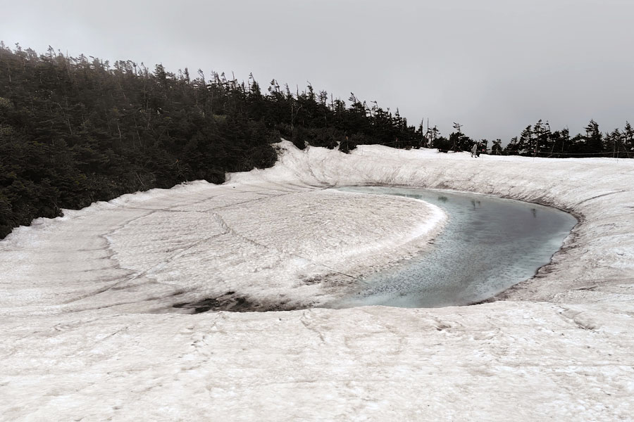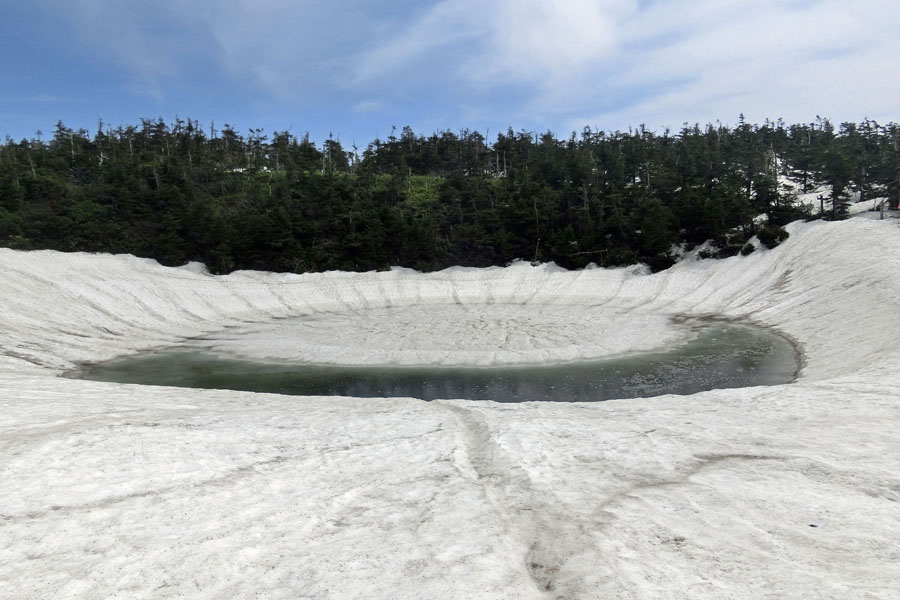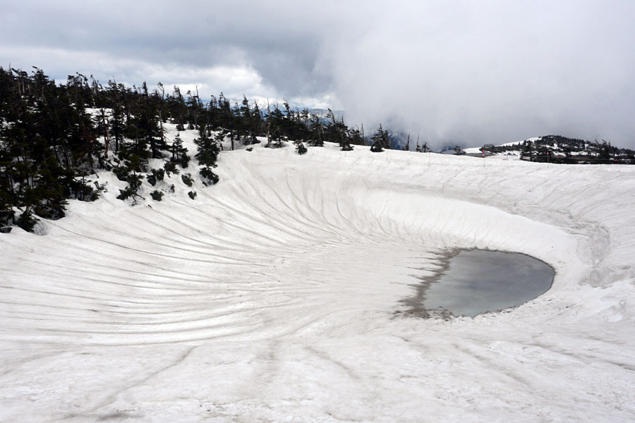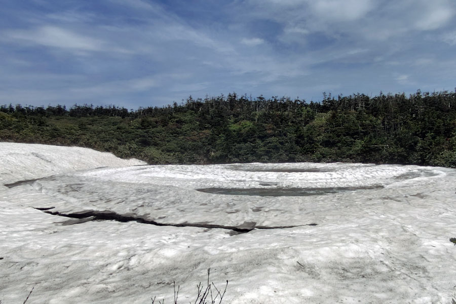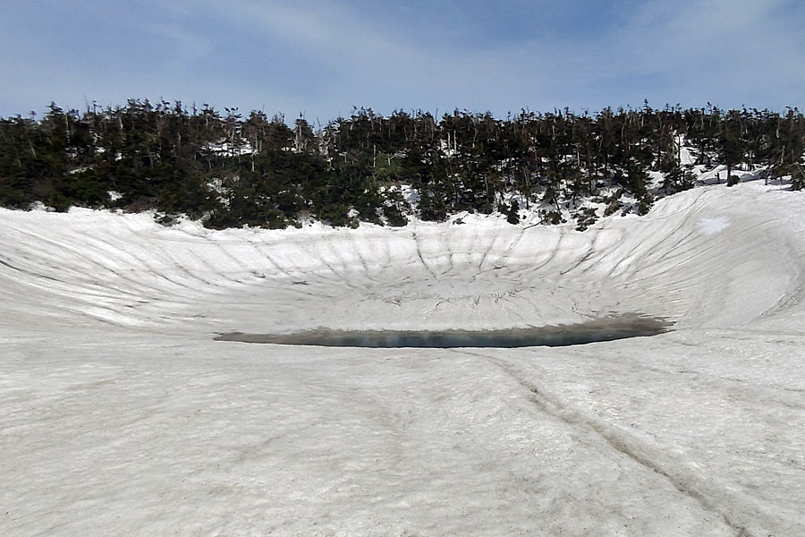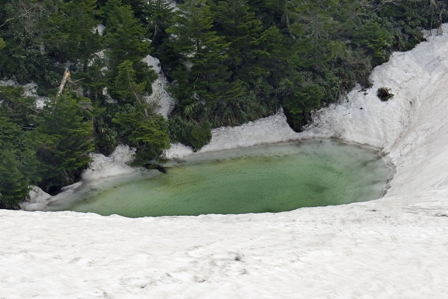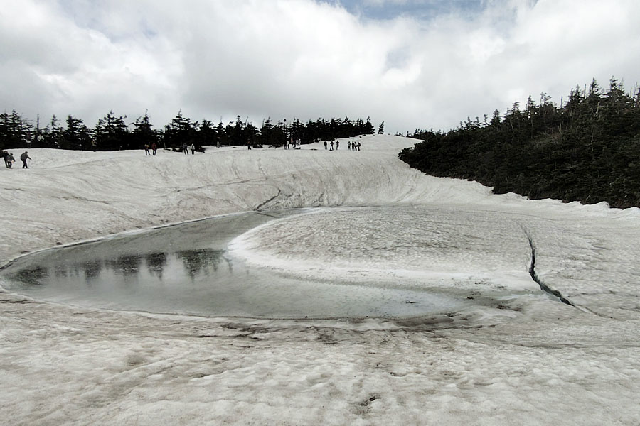 この後、この写真の左側の雪が融けて水面が中央部の雪の丘を囲うように円周形に水溜りが出来ればきれいなドラゴンアイができると思います。