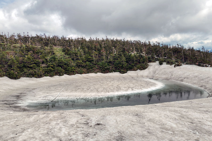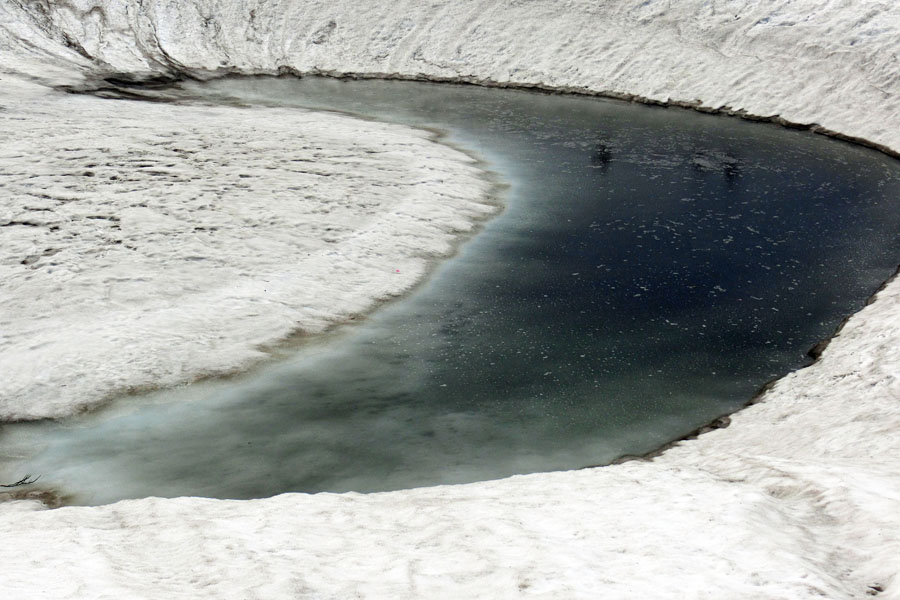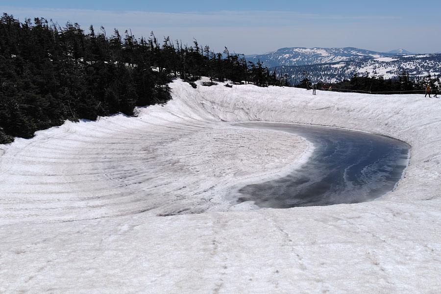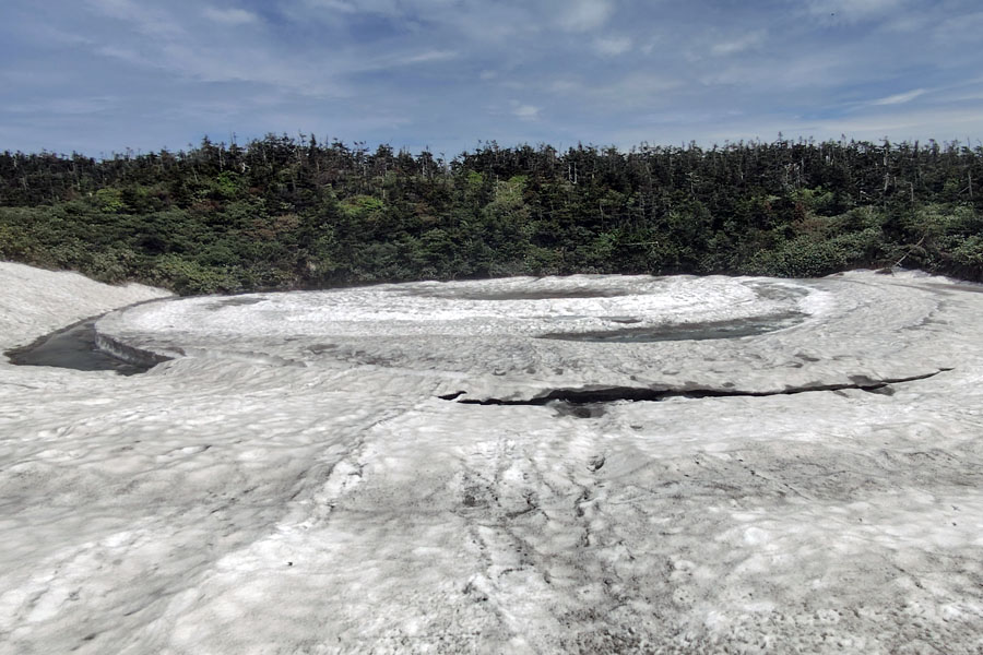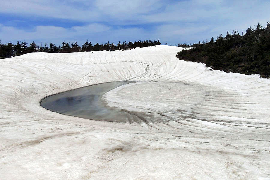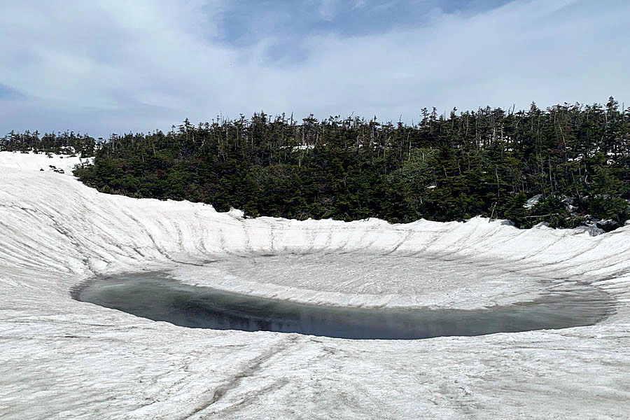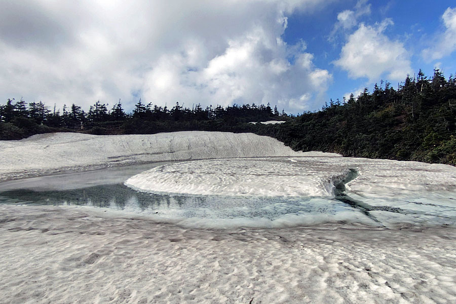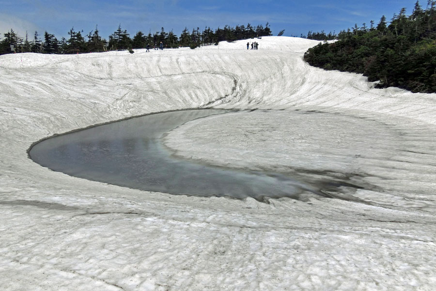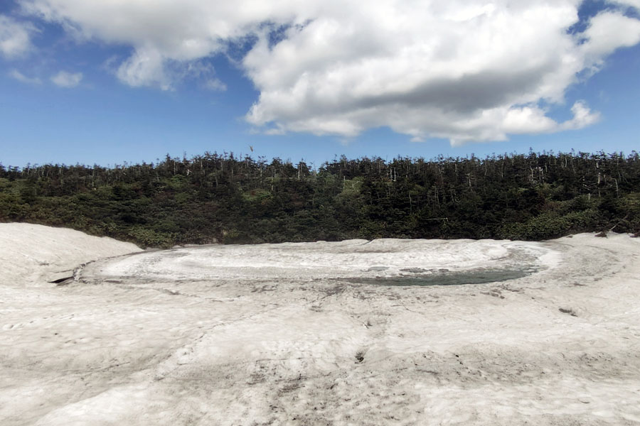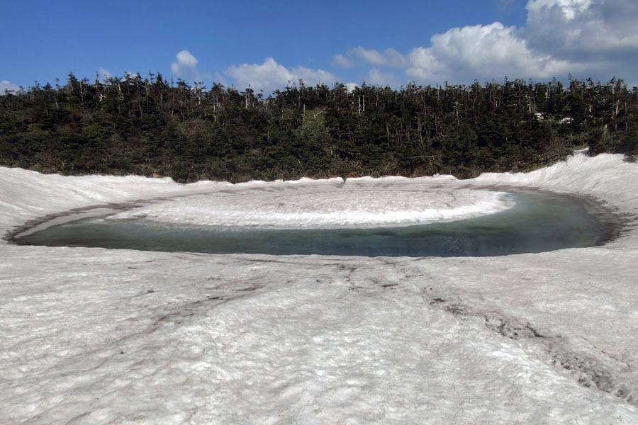この後、この写真の左側の雪が融けて水面が中央部の雪の丘を囲うように円周形に水溜りが出来ればきれいなドラゴンアイができると思います。