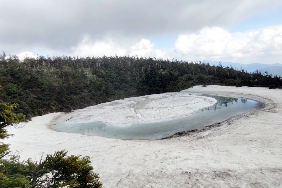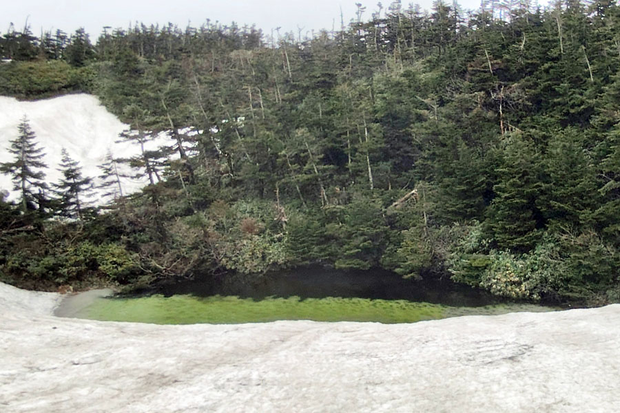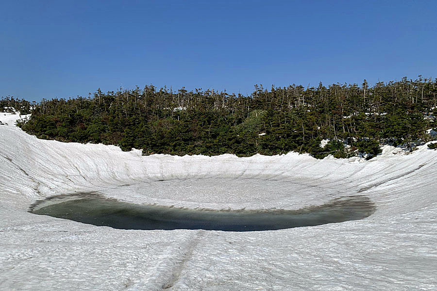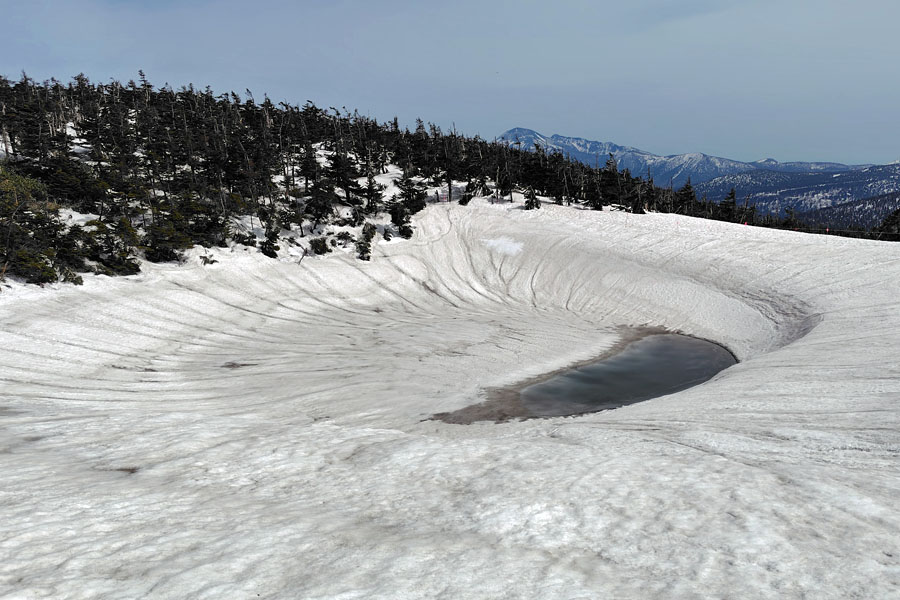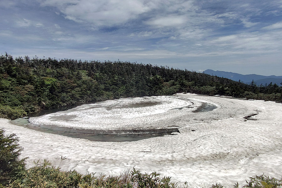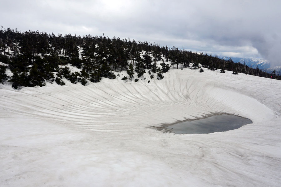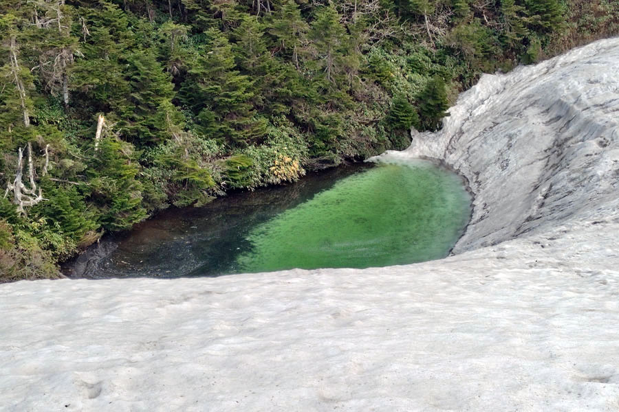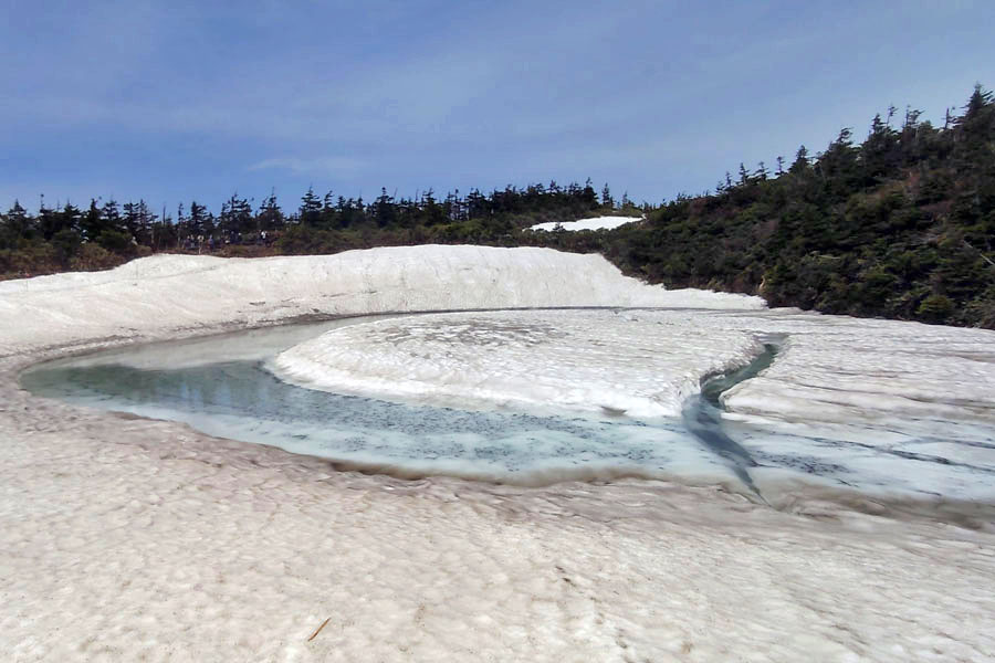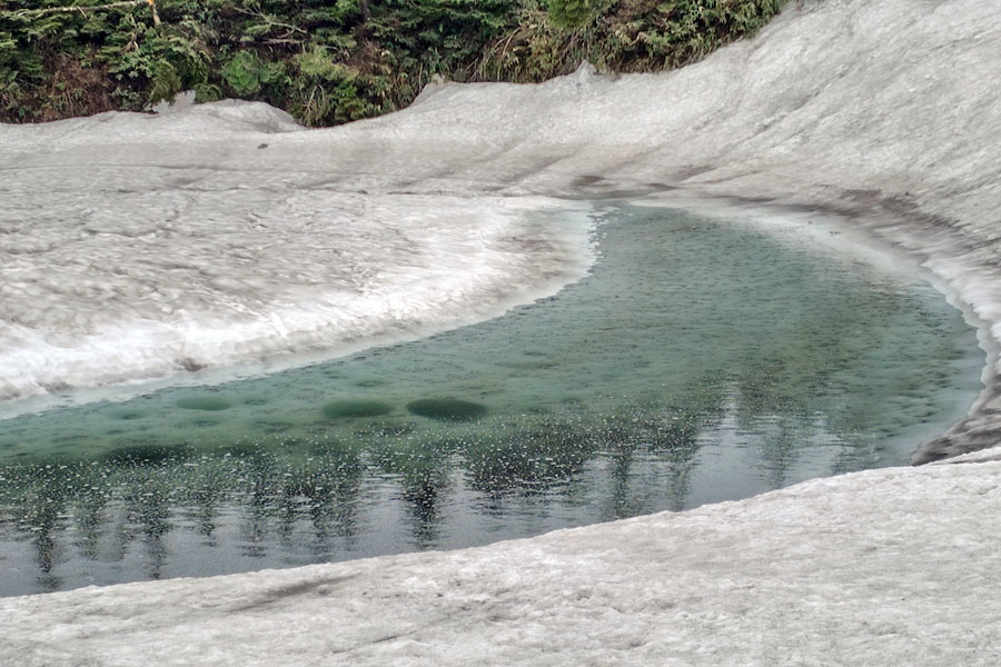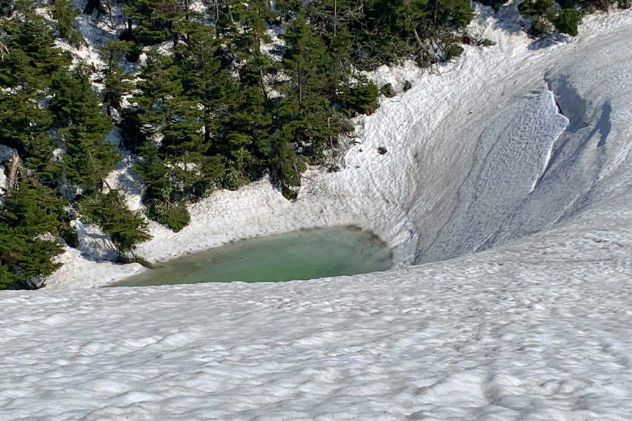この後、この写真の左側の雪が融けて水面が中央部の雪の丘を囲うように円周形に水溜りが出来ればきれいなドラゴンアイができると思います。