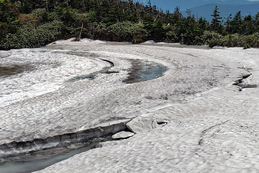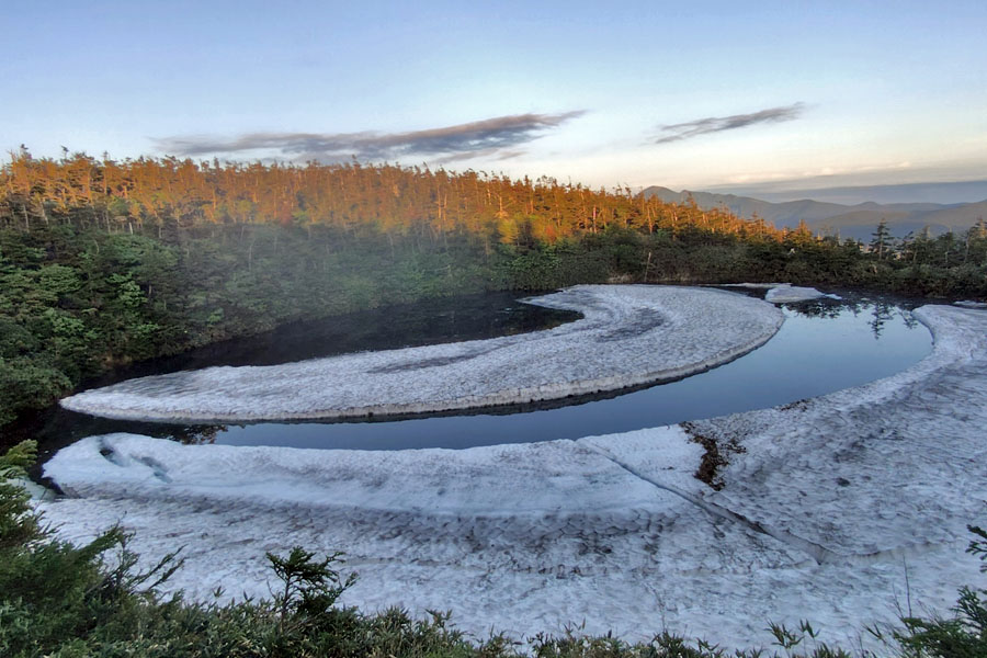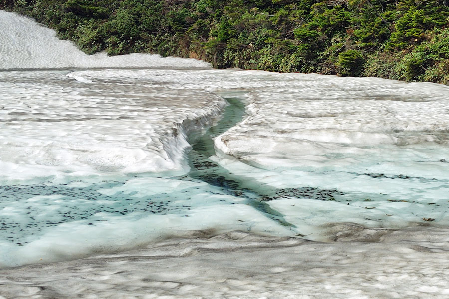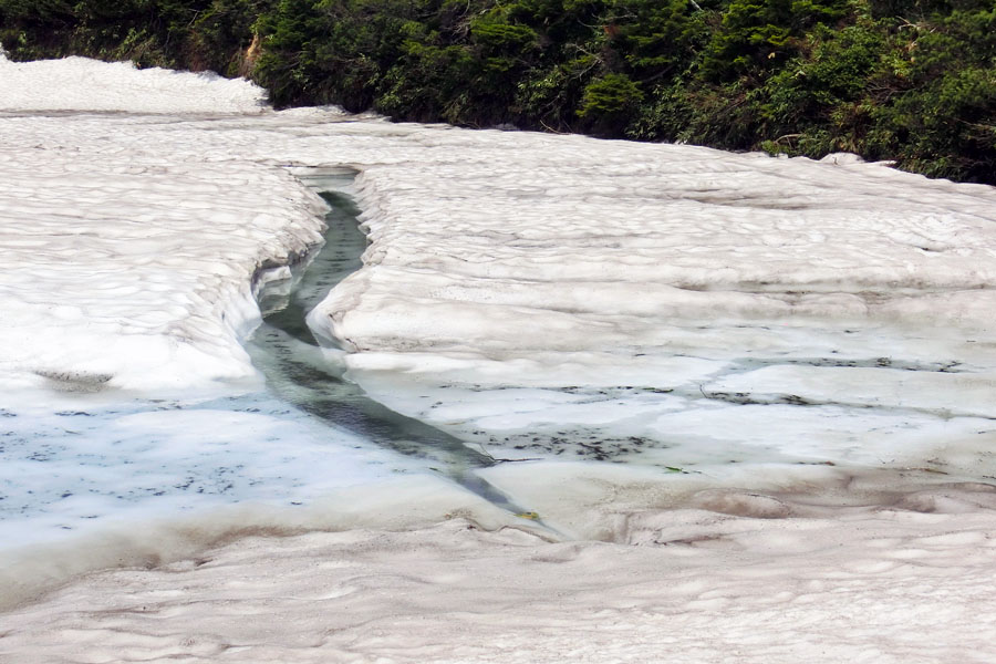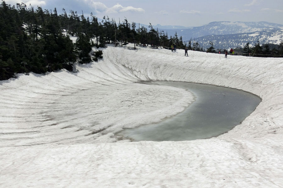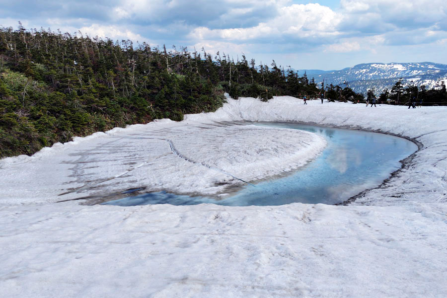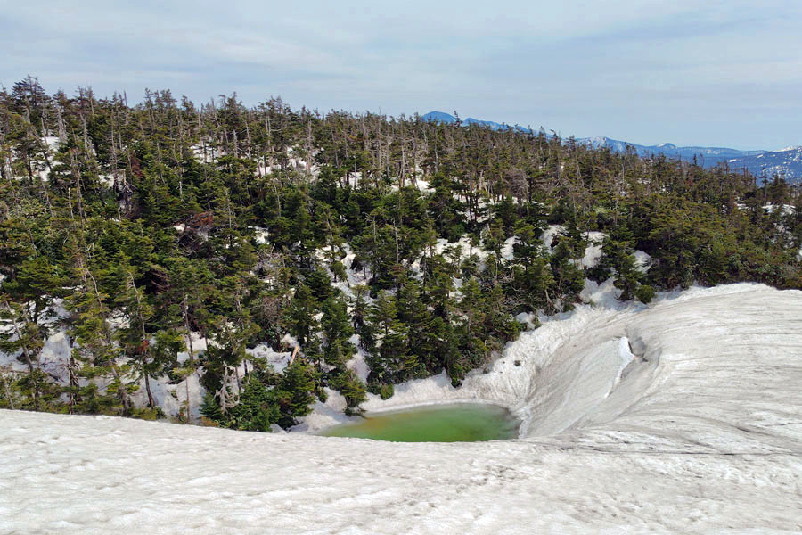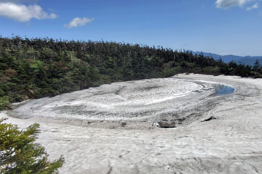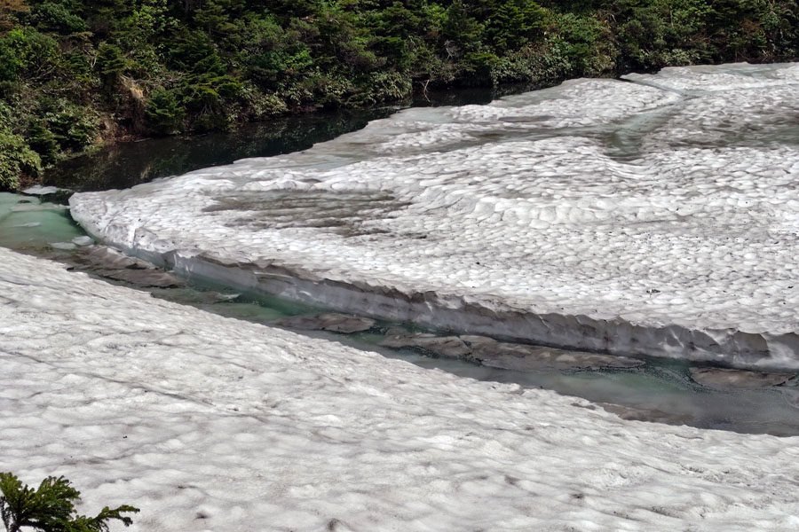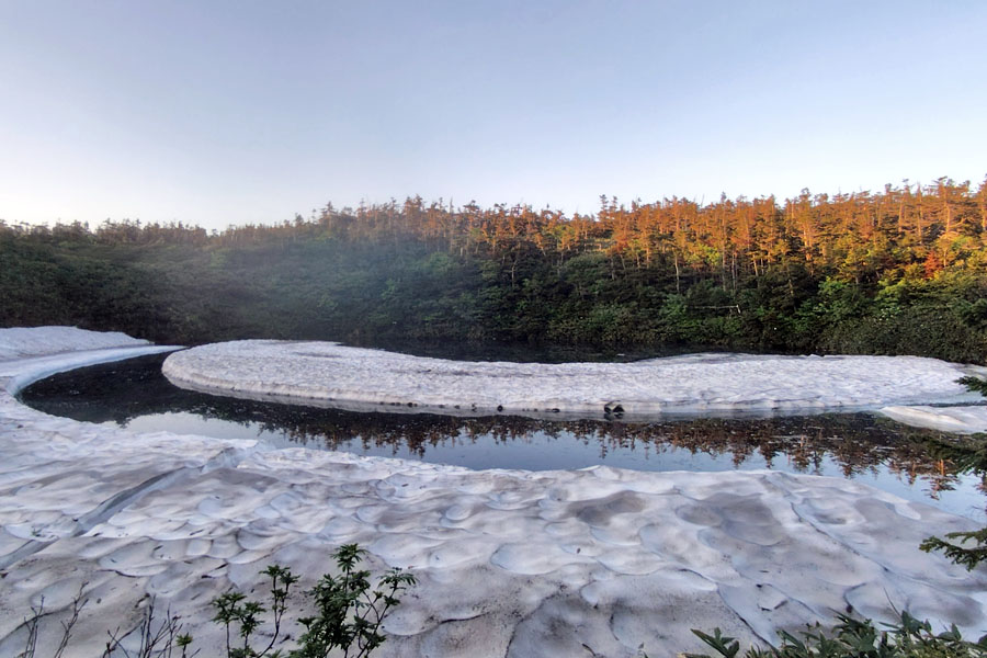 この後、この写真の左側の雪が融けて水面が中央部の雪の丘を囲うように円周形に水溜りが出来ればきれいなドラゴンアイができると思います。