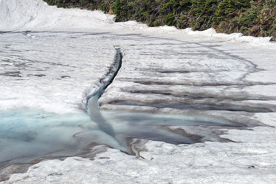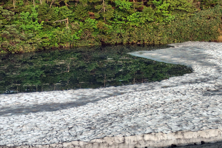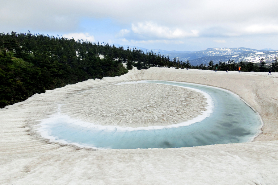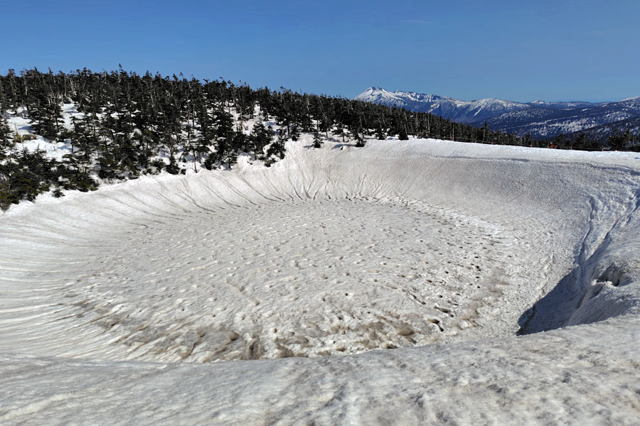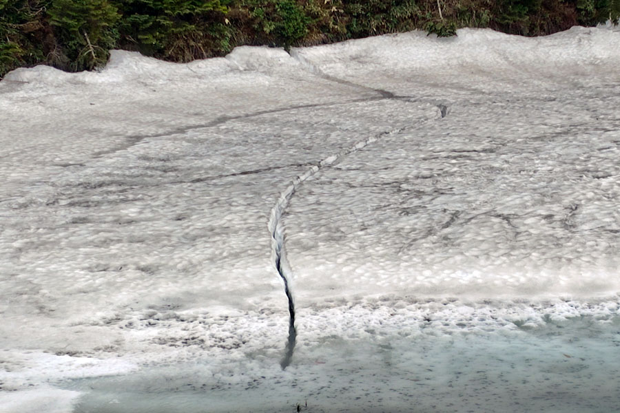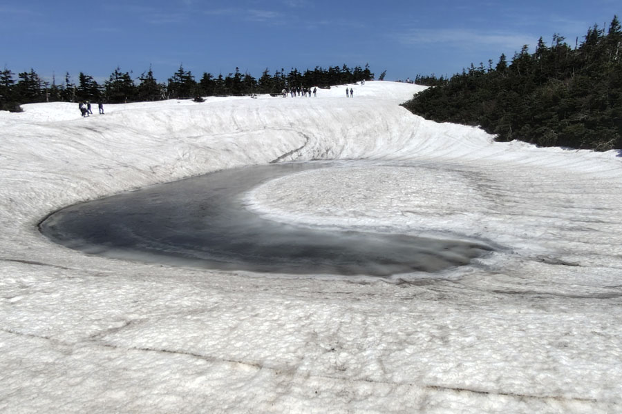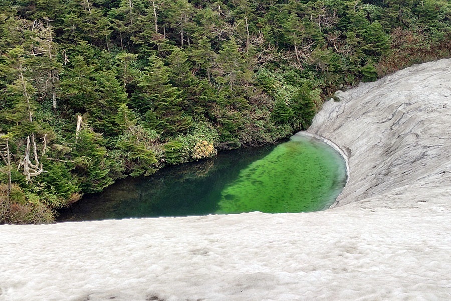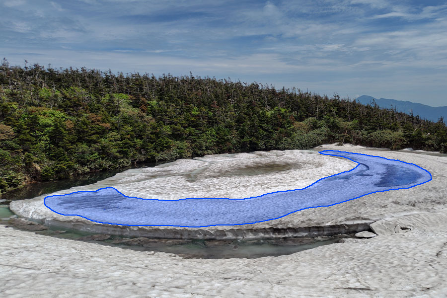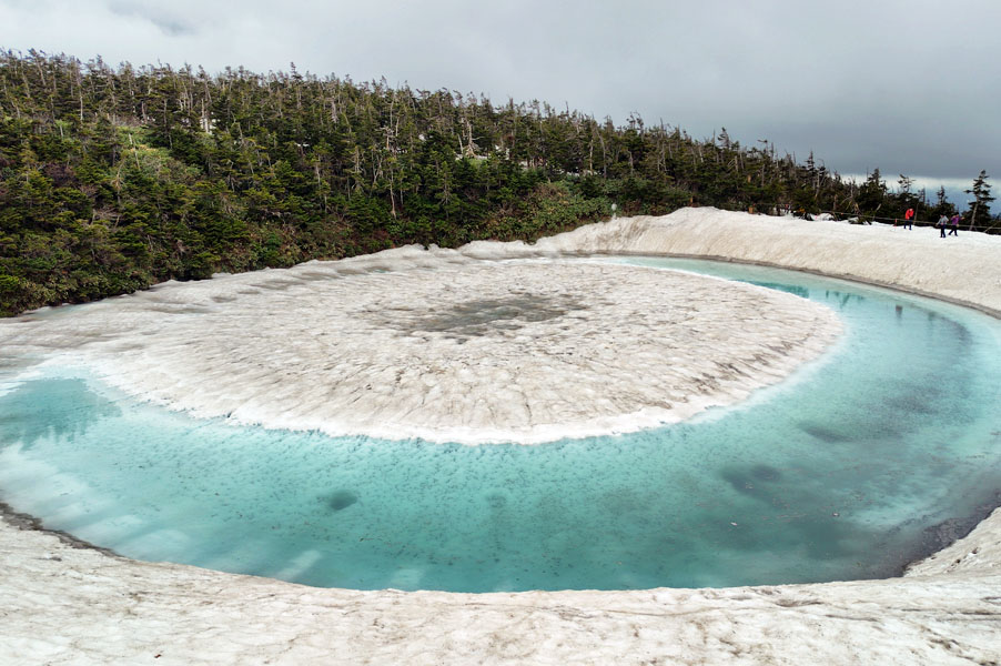 この後、この写真の左側の雪が融けて水面が中央部の雪の丘を囲うように円周形に水溜りが出来ればきれいなドラゴンアイができると思います。