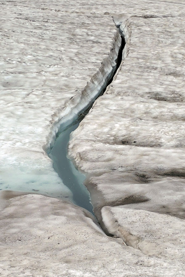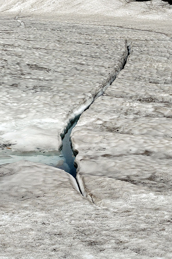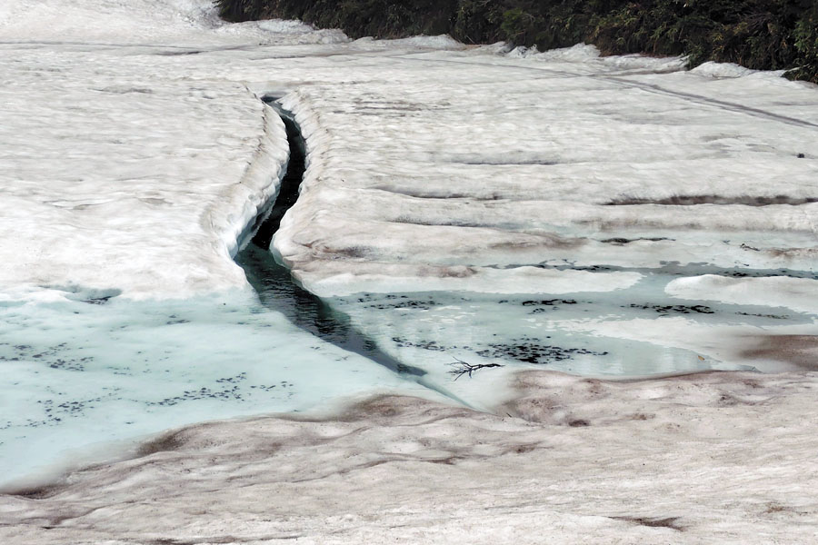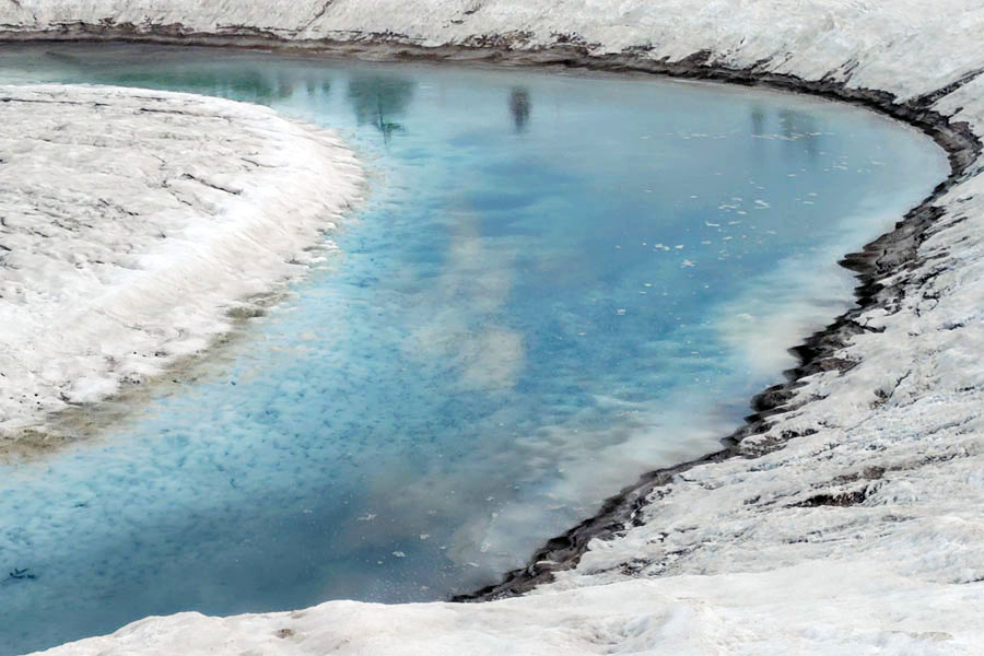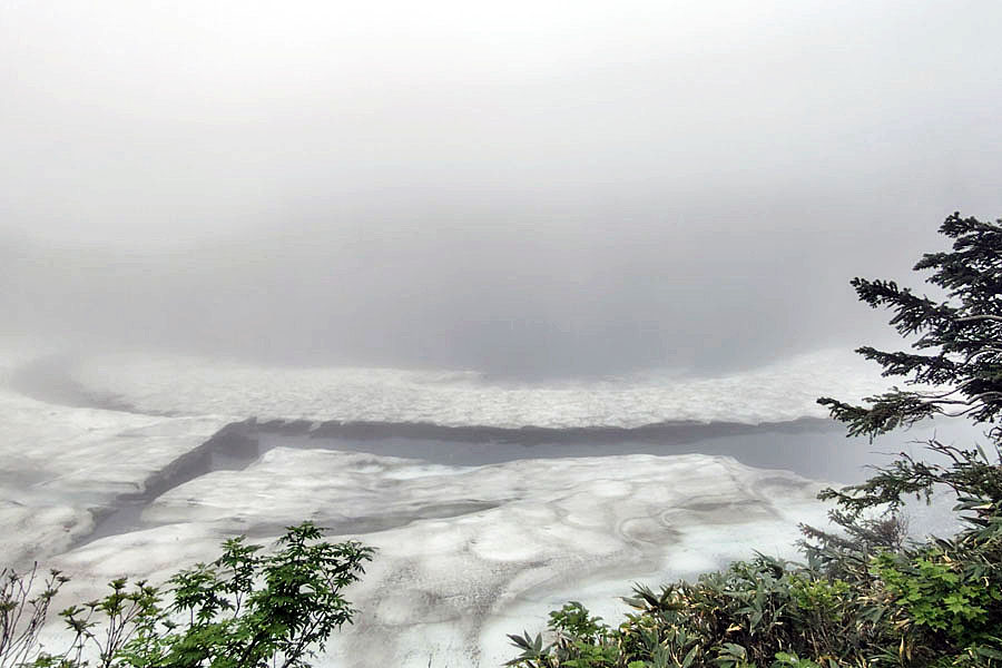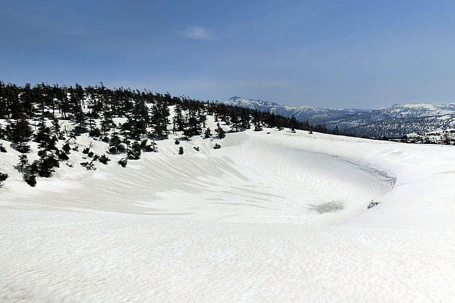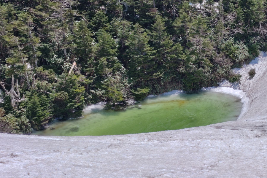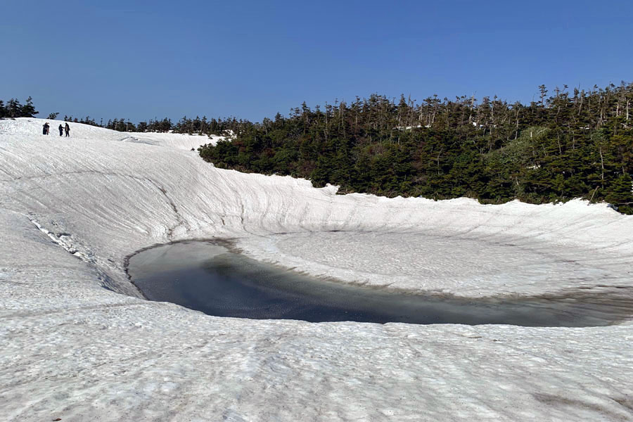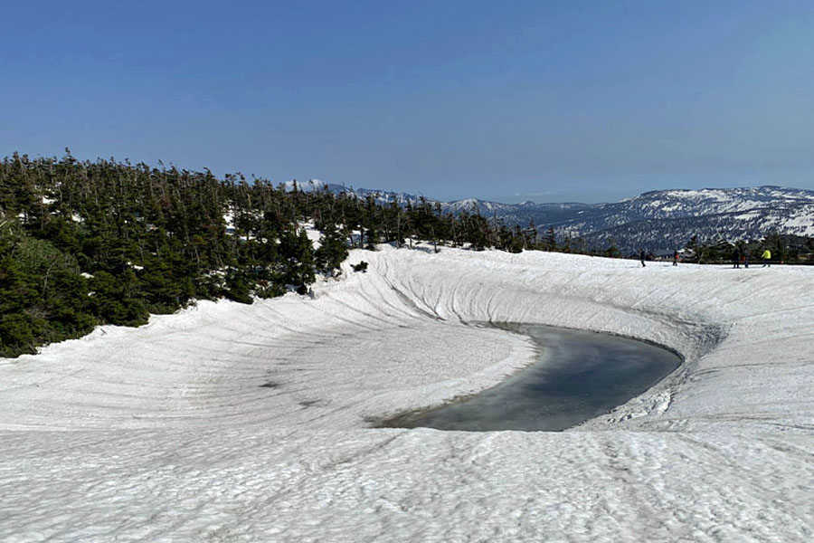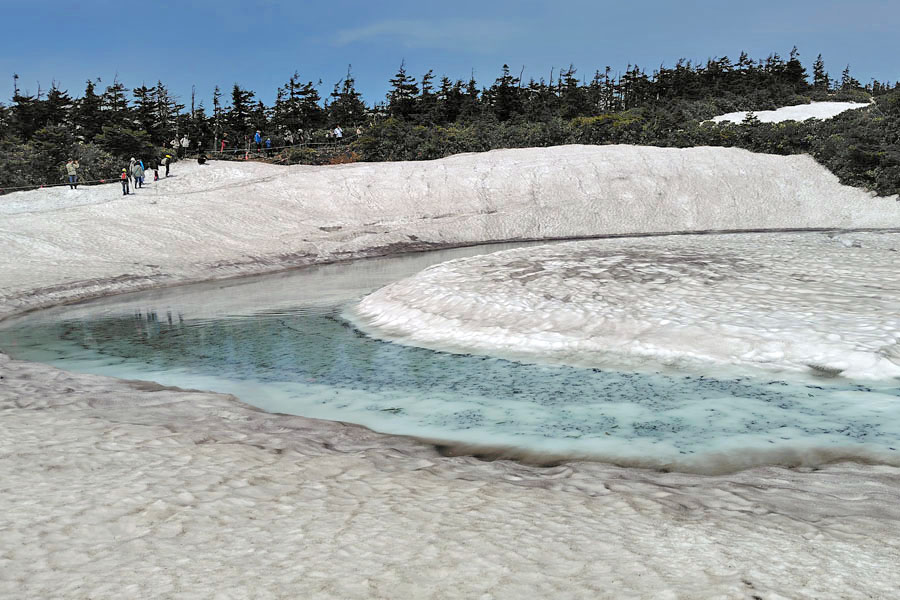 この後、この写真の左側の雪が融けて水面が中央部の雪の丘を囲うように円周形に水溜りが出来ればきれいなドラゴンアイができると思います。