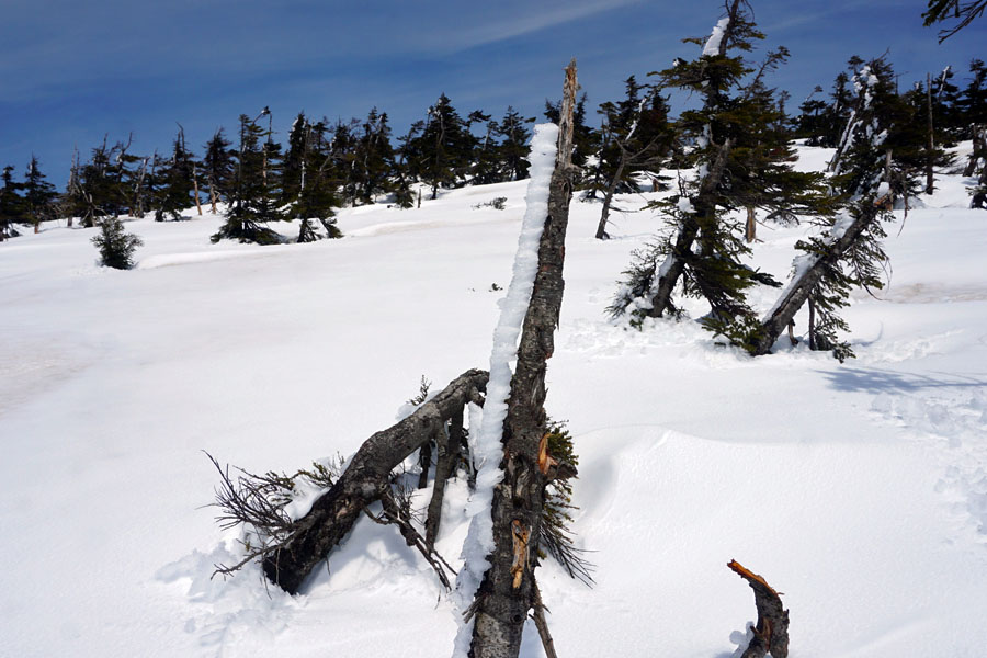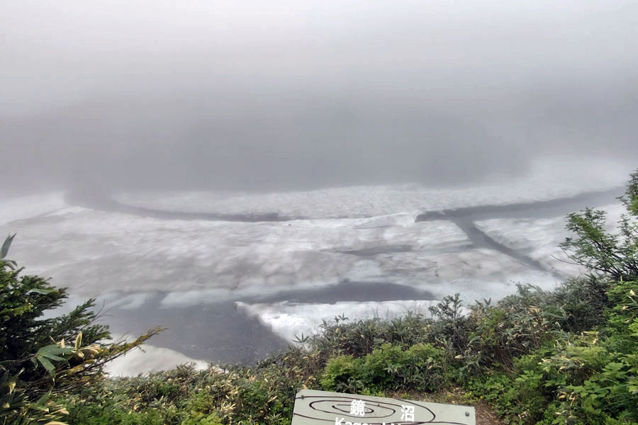 雪の上を目印に従って約200m程度進むと「鏡沼分岐」に到着。