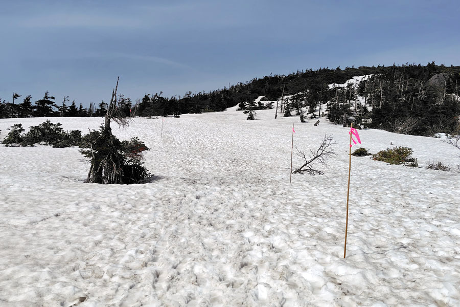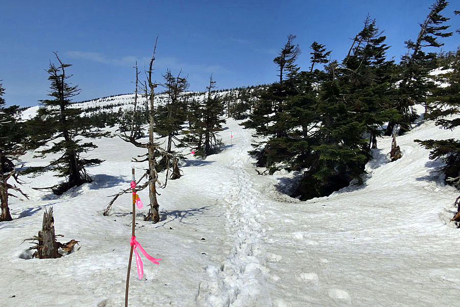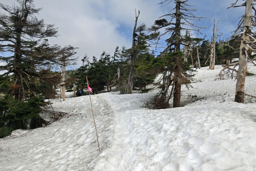 道中には写真にあるような竹の棒にピンク色のテープの付いた目印が設置されています。基本、この目印に沿って進みます。