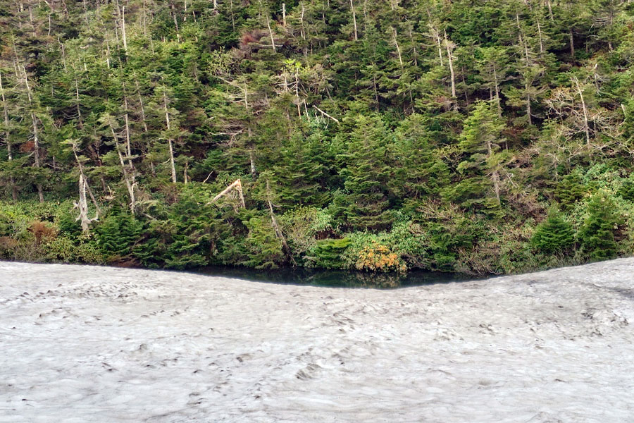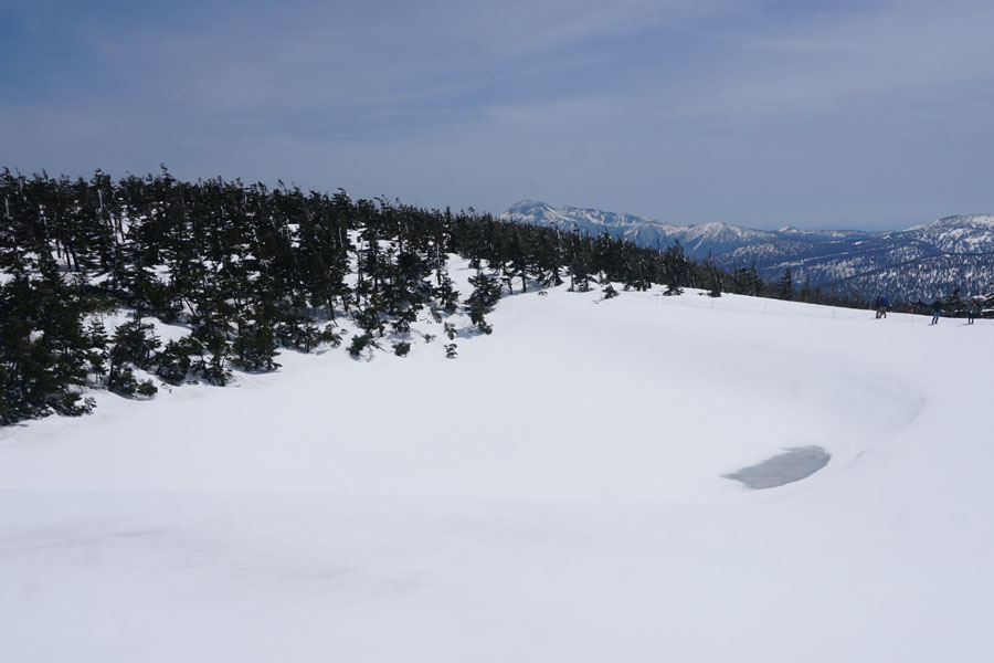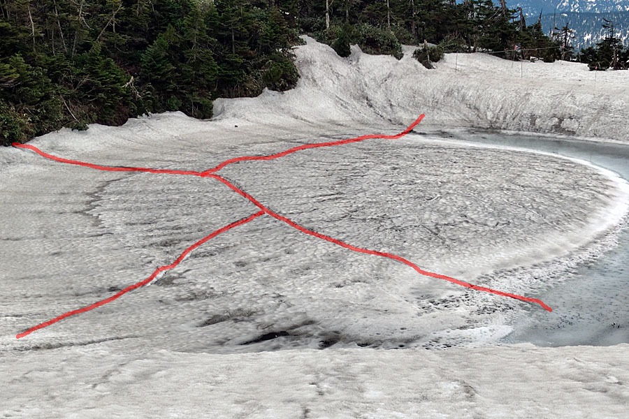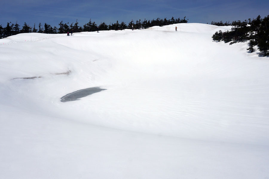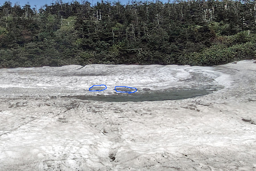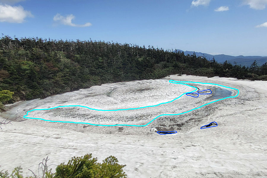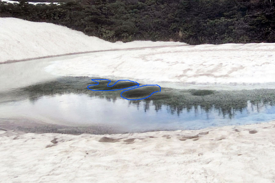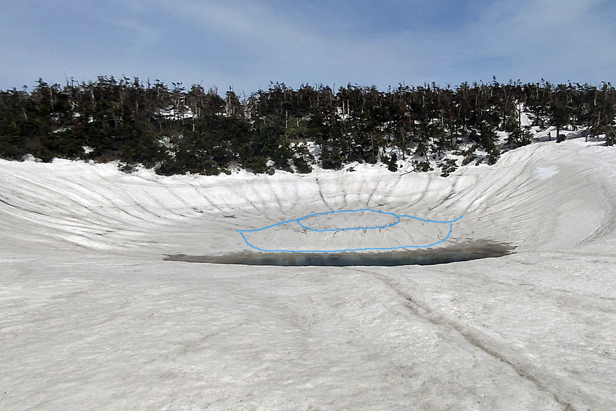 しかし、ドラゴンアイを西側から見てみると、わかりにくいのですが、水たまりの先に黒いすじで楕円形に見える雪の丘が確認できました。