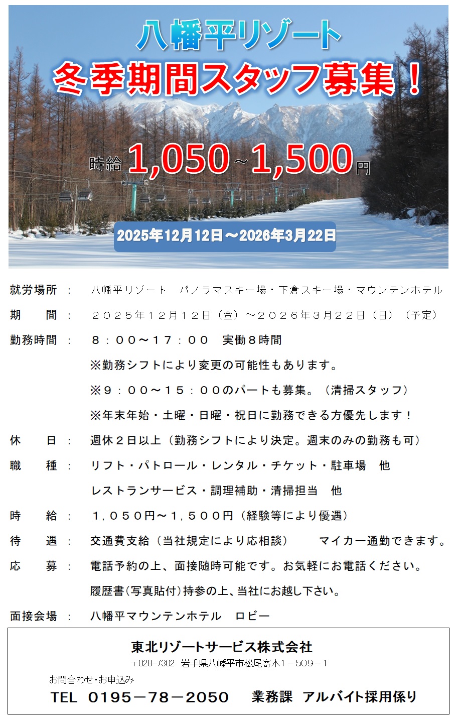八幡平リゾートでは、この冬一緒に働いていただけるスタッフを募集いたしております。