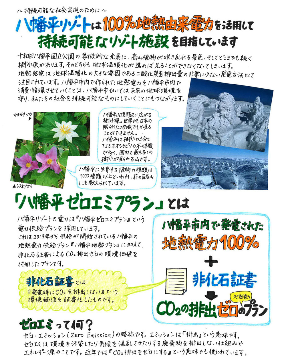 八幡平リゾートに電力を供給してくださる松尾八幡平地熱発電所様は2019年1月29日から発電を開始した新しい地熱発電所です。地熱発電は季節や昼夜に関わらず安定的に発電することができ、松尾八幡平地熱発電所では一般家庭約15,000世帯分の電力を発電する能力があります。