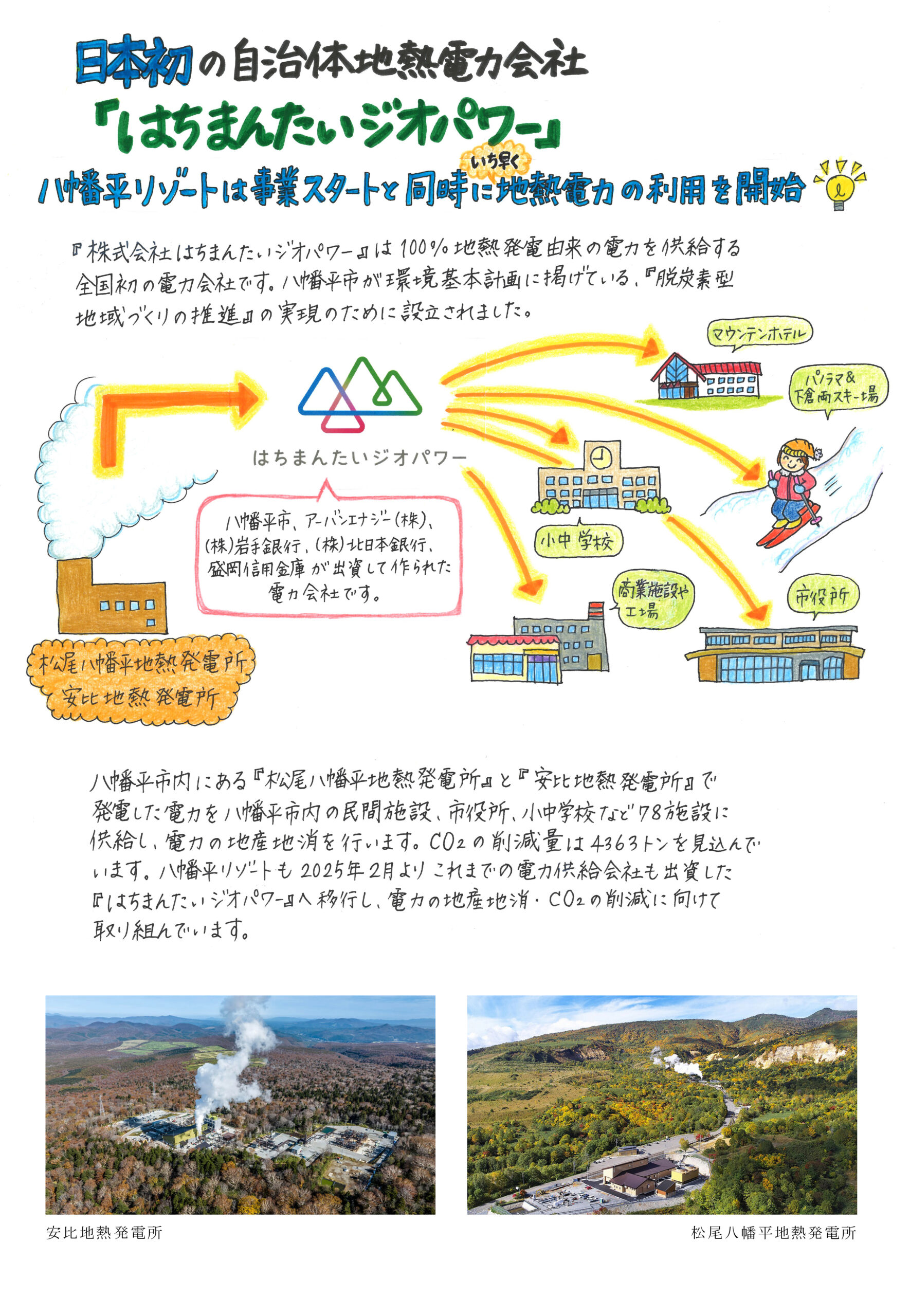 もう1つの電力供給を担ってくださる安比地熱発電所様は2024年3月1日から発電を開始した東北エリアで一番新しい地熱発電所です。安比地熱発電所では一発電出力14,900KWで一般家庭約25,800世帯分の電力を発電する能力があります。